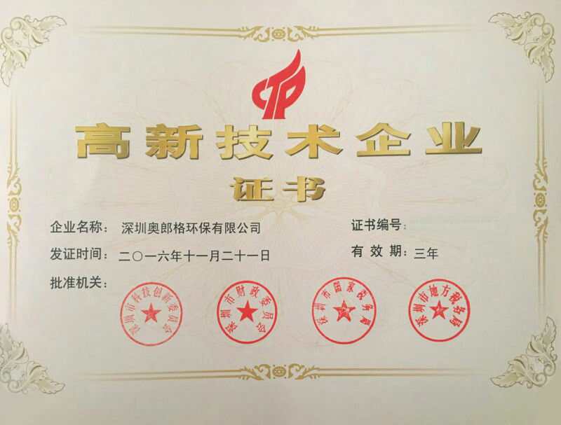 根據(jù)《高新技術(shù)企業(yè)認(rèn)定管理辦法》(國科發(fā)火〔2016〕32號)和《高新技術(shù)企業(yè)認(rèn)定管理工作指引》(國科發(fā)火〔2016〕195號)有關(guān)規(guī)定,深圳奧郎格環(huán)保有限公司赫然在列,獲得高新技術(shù)企業(yè)認(rèn)定。這不僅是奧郎格(Airgle)的一次重要突破,更是在凈化領(lǐng)域中得到多年研發(fā)與企業(yè)貢獻(xiàn)被高度認(rèn)可。特頒發(fā)《高新技術(shù)企業(yè)證書》